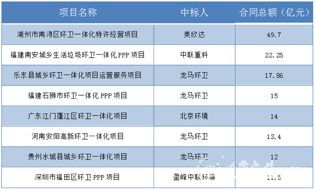 纵观66亿元的云南昆明官渡环卫一体化项目、35亿元的海口市龙华区环卫一体化项目、34亿元的海口市美兰区环卫一体化项目、27亿元的四川成都崇州市城乡一体化项目等等,真真是“你方唱罢我登场”。